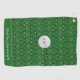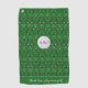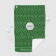 Personalise this stylish green golfing towel with your initials. The design has a golf ball in the centre, on a green background with a pattern of golf clubs. The caption in white script can be edited for your own favourite golf slogan. Or just use the default "Work less, play more golf".