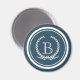Monogram design with laurel wreath decoration in striped round shape on blue background