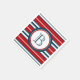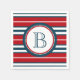 Nautical themed design with monogram decoration in round shape with rope illustration on blue, red and white striped background