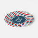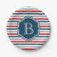Nautical themed design with monogram decoration on blue, white, red and grey striped background