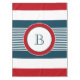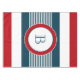 Nautical themed design with monogram decoration in round shape on blue, white and red striped background