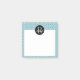 This post it note pad features a white trendy doodle swirl pattern on a teal background. A black circle, at the top, offers a custom monogram and name.