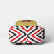 A graphic design of chevron pattern in red, black and white. Cool contrast with dark beige colour and name.