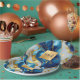 A paper plate featuring a faux gold, blue and white marbled design.