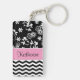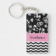 Modern and trendy floral and chevron pattern keychain features white chevron stripes and a white floral pattern on a black background and a pastel pink accent frame for your initial, name or other text on the front and back. Show your personality with this fun and trendy keychain. Makes a great gift for all occasions. Click the "Customise it!" button to change the font size, font colour, font style and more!