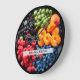 Monogram kitchen wall clocks with image of a variety of fruits and berries and monogram emblem you can personalise with any ladies name officially naming it her kitchen.
