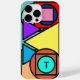 Monogram initial in black text on bottom teal circle. Funky geometric pattern with blue, red orange, pink, teal, purple, yellow, teal green, brown. Fun geometric shapes in circles, triangles, rectangles pattern. Original Design © TamiraZDesigns.