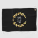 This golf towel is shown with a gold laurel wreath on a Black background with custom monogram initials in White.