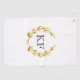 This golf towel is shown with a gold laurel wreath on a White background with custom monogram initials in Black.