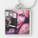 A modern, urban art graffiti of a woman with a pretty rose tattoo holding a camera. Beautiful street art at its finest, and you can now take it with you everywhere you go with this key chain. Add your monogram to it and make it uniquely yours.