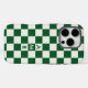 Cool iPhone case features a bold green and cream chequered pattern with a customisable monogram. Add (or delete) 3 initials in the sidebar to personalise it. The geometric chequerboard pattern is made of rows of alternating beige and hunter green squares. Other case styles and models also available in the sidebar.