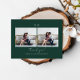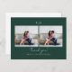 This modern minimalist dark forest green and white wedding two photo thank you postcard features elegant hand lettering and a simple monogram with a custom personalised thank you message and return address on the back of the chic hunter green card.
