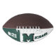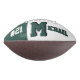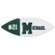 This is a full size football with one panel designed with a monogram name (large first letter) and uniform number, in popular college colours. This one is shown in Green and White. The football is also available with two white panels so that a 2nd panel may include designs or room for signatures.