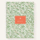 Beautiful greenery pattern by William Morris. Green and brown, white background, orange shield with monogram and custom name. Elegant and sophisticated.