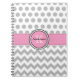 Modern and trendy monogrammed spiral notebook features grey and white chevron stripes and polka dots with a pink accent ribbon stitched border with a round pink accent frame outlined in black and white for your initial and name. Show your personality with this fun and trendy chevron stripe spiral notebook. Perfect for a journal, taking notes, work, school and home. Makes a great gift for all occasions. Click the "Customise it!" button to change the text size, text colour, font style and more! Please note: the pink accent horizontal ribbon stitch frame border is solid pink with a ribbon stitch appearance.