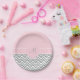 Monogrammed grey and white chevron pattern with pastel pink and white polka dot paper plate. The design features a grey and white chevron pattern on the bottom half and on the top half a pastel pink and white polka dot pattern. The design is crossed by a pastel pink band and in the middle there is a pastel pink with your custom initial.