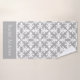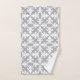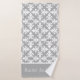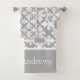 This modern design features a tiled fleur-de-lis pattern in grey and white with a personalised name at the base of the bath towel. Personalise by editing the text boxes provided.
