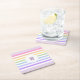 Monogram in White Circle Pastel Rainbow Stripes Square Paper Coaster