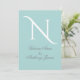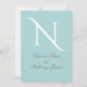 Robin egg blue background with a fresh white monogram. The bride and groom names on the front are in a subtle grey. Invite typography on the reverse of this beautiful invitation is also in grey to match the front of this invite. The font is a fancy script. Just gorgeous. 100% customer satisfaction guaranteed with “Zazzle”.