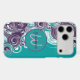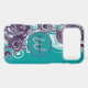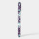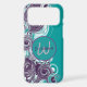 The phone case design features a spiral wave in white and shades of purple with an initial letter monogram centred on it. Personalise the template field with your information, remove one text element or edit using the design tool to select a font style, size, and colour you prefer.