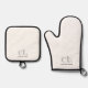 Monogram Initial Name White Oven Mitt & Pot Holder Set. Easily replace the template monogram initial and name with your own. Choose an Oven Mitt and/or Pot Holder. Choose the style from the dropdown menu between silver quilted or black silicon.