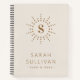 Elegant notebook with your monogram initial inside a border of radial dots resembling a sun on light neutral/ivory background. Below is a teplate field for your name and one line of custom text. Colours can be customised with the design tool.