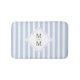 Bath mat featuring a light dusty blue and white striped pattern with your monogram initials in dark grey over a white diamond shape. All colours are customisable.