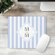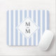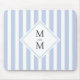 Mousepad featuring a light dusty blue and white striped pattern with your monogram initials in dark grey over a white diamond shape. All colours are customisable.