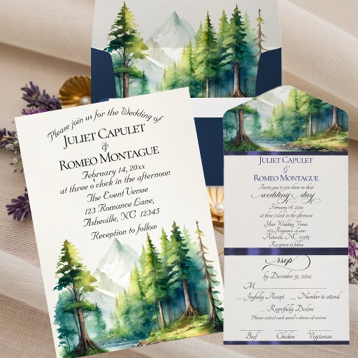 The Monogram Initials Wedding Invitation Belly Band features leaf monogram frames intertwined, each with a first initials on an emerald background. Personalise with the bride & groom's initial. Designed to coordinate with the Watercolor Mountain Wedding Invitation Collection. To change details, click «Personalise». To move the text or change the text size, font, or colour click «Click to customise further»