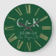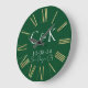 This custom wedding keepsake clock features a simple and modern design. Two sample monogram initials are pictured in the centre, followed by a wedding date and location. The background features an elegant and earthy forest green colour. The hours are printed in a gold Roman numeral design.