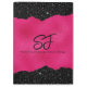 This professional custom clipboard feature a glamourous black and hot pink design. The background features a textured pink foil style pattern. The top and bottom portions feature an abstract, luxurious black texture with accents of glitter. Sample monogram initials are printed in the centre in an elegant script font, followed by a name and job title.