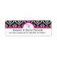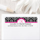 Damask White with Black background lined with a hot pink border. Hot Pink Monogram on white background. Wedded couples name in black on a white background with black return mailing address text. This makes a perfect coordinated label to any damask wedding RSVP or invitation. Place these return address labels on the back of your wedding invitation envelopes or on the front left side of any envelope. Save yourself from hand writing your return address on all out going mail.