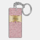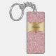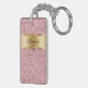 Monogram keychain with pretty printed gold monogram emblem you can personalise with any name, initials, or message and printed pink diamond jewel bling, along with printed pink glitter background you can use as a gift or party favour. Designed as keychains for women or keychains for girls, in a fun two side acrylic design that lets you carry your keys in style.
