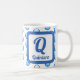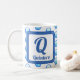 This monogram mug is a great way to add a personal touch to your morning tea or coffee. A bright blue polka dot pattern appears against a white background on both sides of this mug. The letter "Q" is featured in a square along with the family name. The letter and your name can quickly and easily be personalised.