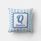 This monogram pillow is a great way to add a colourful accent in your home or create a special keepsake for a wedding or housewarming. A bright blue polka dot pattern appears against a white background on both the front and back of this pillow. The letter "Q" is featured in a square along with the family name. The letter and your name can quickly and easily be personalised.