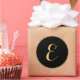 Monogram E in script, gold coloured on black background