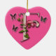 Monogram letter F with rose and butterflies on a heart shaped ornament.