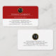 Cover features an upper red layer with a thin white line near its base. Here lies an empty gold circle logo where you can place your name initials-monogram (You can use different sizes of fonts or styles to your liking). Underneath your monogram is your prestigious name with the job title below the white line. Inside the white layer are your contact details.