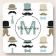 These fun drink coasters feature a pattern of top hats, moustaches, and bow ties on a white background. Colours include teal, light blue, tan, brown and black. A white circle banner at the centre holds your monogram in matching blue and your name written in black across it.