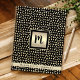 A faux gold foil square with a black script monogram initial and custom name on a gold band, overlaying a luxury gold oblong dots pattern on black, highlight this chic, girly, modern monogramed spiral journal notebook. 8 different inside paper designs to choose from. Makes a stylish statement every time you use it. A great gift for a friend, as well as yourself!