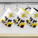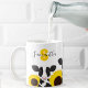 A monogram mug that features your name, cow illustrations, and sunflowers. The mug has a yellow, white, and black colour scheme. Simply customise the name and monogram, add this mug to your cart, and enjoy cows and flowers with every warm beverage.