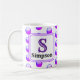 This monogram tea or coffee mug is a great way to add a colourful accent to your morning routine. A bright purple polka dot pattern appears against a white background on both sides of this mug. The letter "S" is featured in a square along with the family name. The letter and your name can quickly and easily be personalised.
