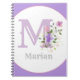 Design features the recipient's Monogram & Name with Flowers either side in a water color pastel style. Initial is the letter M. Example shows Marian.