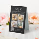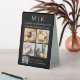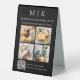 Modern Minimalist Business Table Tent Sign with 4 Photos. Black & White or choose your custom colours. Add your website or social media web address to the QR Scan Code. Allow customers to use the scan to access information on your items such as products or menu items. Perfect for retail companies, small business shops, mall kiosks, trade show and event booths, hospitality, salons, spas, bakeries, cafes, restaurants, bars and more. Easy to personalise with your monogram initials, business name and information, photos, slogan or even add your logo or personal brand design.