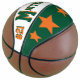 This is a full size basketball with two panels designed with a monogram name (large first letter) and uniform number, in popular college colours. This one is shown in Orange, Green, and White. The second panel has team colours with three stars. All text, art, and colours can be removed, or changed as desired. One panel can be left white for autographs, etc.