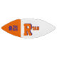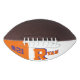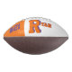 This is a full size football with one panel designed with a monogram name (large first letter) and uniform number, in popular college colours. This one is shown in orange and purple. The football is also available with two white panels so that a 2nd panel may include designs or room for signatures.