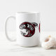 Add your monogram to this native Haida killer whale design coffee mug. Deep burgundy, white and black shapes circle the cup. Your initials are centred in the middle of the design.