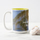 Personalise monogrammed initial in sunny yellow text. Background has blue sky with pretty close-up of three palm trees with fronds blowing in the ocean breeze. Fun keepsake mugs for the newlywed bride and groom. Original Photography design by TamiraZDesigns. Visit my store for more Original designed items via: www.zazzle.com/tamirazdesigns