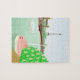 Monogram Paris Eifel Tower Puzzle with Gift Box with Paris cityscape - Eiffel Tower, Seine river with boats, blooming chestnut tree and Alexander Bridge (Alexander III Pont), one of the most beautiful places in Paris. Pink and white boat with custom name on it. Pastel colours: aqua, blue, brown, green, pink. Lovely and romantic personalised gift.