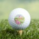 This golf ball features a hand-painted golf course scene with a vintage golf bag brimming with soft pink peonies and classic clubs. A charming mix of floral elegance and golf style, ready to be personalised with your monogram and name.